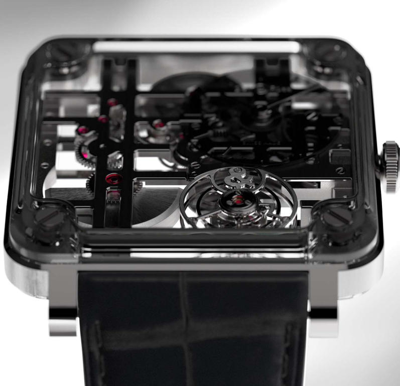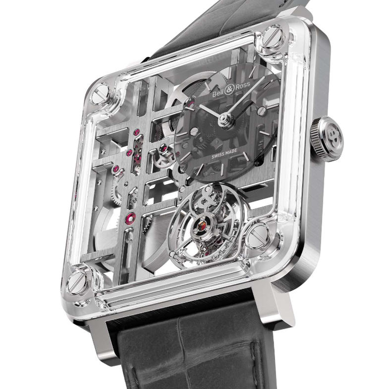 With no dial and sapphire crystals front and back, transparency is the name of the game. Every single component of the movement, from small to large, is exposed on both sides of the case and suspended beneath a series of horizontal and vertical bridges reminiscent of Piet Mondrian’s grid-pattern compositions. The clean geometry of the bridges creates pockets of negative space to showcase the calibre BR-CAL.389, a proprietary automatic movement developed for top clone Bell & Ross watches by Concepto.